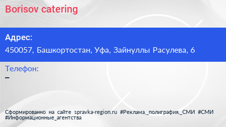 Borisov catering по адресу 450057, Башкортостан, Уфа, Зайнуллы Расулева, 6 в дальнейшем Организация, размещена в следующих категориях: