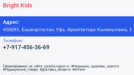 Bright Kids по адресу 450095, Башкортостан, Уфа, Архитектора Калимуллина, 1 в дальнейшем Организация, размещена в следующих категориях: