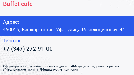 Buffet cafe по адресу 450015, Башкортостан, Уфа, улица Революционная, 41 в дальнейшем Организация, размещена в следующих категориях: