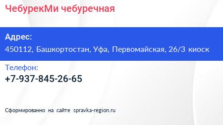 ЧебурекМи, чебуречная по адресу 450112, Башкортостан, Уфа, Первомайская, 26/3 киоск в дальнейшем Организация, размещена в следующих категориях: