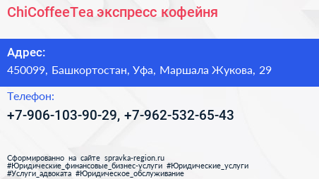 ChiCoffeeTea, экспресс-кофейня по адресу 450099, Башкортостан, Уфа, Маршала Жукова, 29 в дальнейшем Организация, размещена в следующих категориях: