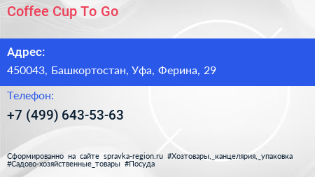 Coffee Cup To Go по адресу 450043, Башкортостан, Уфа, Ферина, 29 в дальнейшем Организация, размещена в следующих категориях: