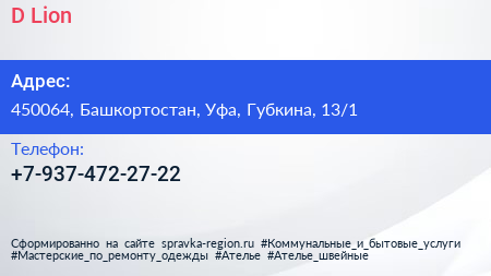 D.Lion по адресу 450064, Башкортостан, Уфа, Губкина, 13/1 в дальнейшем Организация, размещена в следующих категориях: