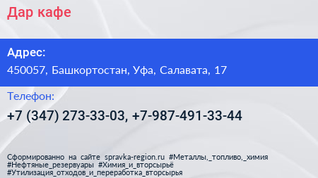 Дар, кафе по адресу 450057, Башкортостан, Уфа, Салавата, 17 в дальнейшем Организация, размещена в следующих категориях: