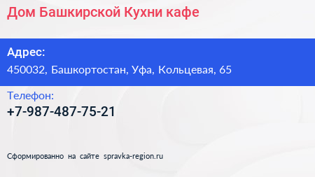 Дом Башкирской Кухни, кафе по адресу 450032, Башкортостан, Уфа, Кольцевая, 65 в дальнейшем Организация, размещена в следующих категориях: