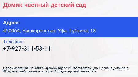 Домик, частный детский сад по адресу 450064, Башкортостан, Уфа, Губкина, 13 в дальнейшем Организация, размещена в следующих категориях: