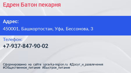 Едрен Батон, пекарня по адресу 450001, Башкортостан, Уфа, Бессонова, 3 в дальнейшем Организация, размещена в следующих категориях: