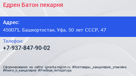 Едрен Батон, пекарня по адресу 450071, Башкортостан, Уфа, 50 лет СССР, 47 в дальнейшем Организация, размещена в следующих категориях: