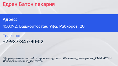 Едрен Батон, пекарня по адресу 450092, Башкортостан, Уфа, Рабкоров, 20 в дальнейшем Организация, размещена в следующих категориях: