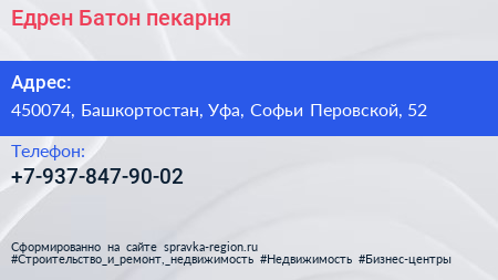 Едрен Батон, пекарня по адресу 450074, Башкортостан, Уфа, Софьи Перовской, 52 в дальнейшем Организация, размещена в следующих категориях: