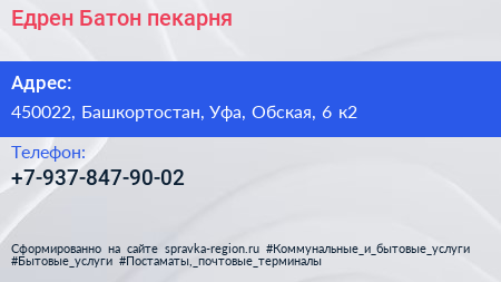 Едрен Батон, пекарня по адресу 450022, Башкортостан, Уфа, Обская, 6 к2 в дальнейшем Организация, размещена в следующих категориях: