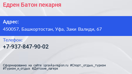 Едрен Батон, пекарня по адресу 450057, Башкортостан, Уфа, Заки Валиди, 67 в дальнейшем Организация, размещена в следующих категориях: