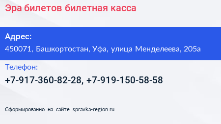 Эра билетов, билетная касса по адресу 450071, Башкортостан, Уфа, улица Менделеева, 205а в дальнейшем Организация, размещена в следующих категориях: