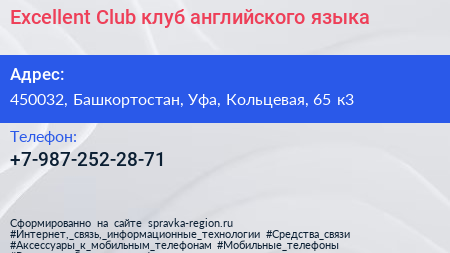 Excellent Club, клуб английского языка по адресу 450032, Башкортостан, Уфа, Кольцевая, 65 к3 в дальнейшем Организация, размещена в следующих категориях: