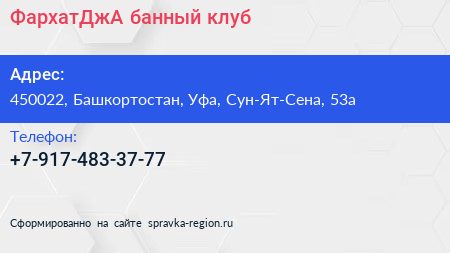 ФархатДжА, банный клуб по адресу 450022, Башкортостан, Уфа, Сун-Ят-Сена, 53а в дальнейшем Организация, размещена в следующих категориях: