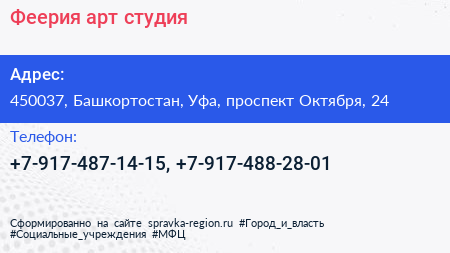 Феерия, арт-студия по адресу 450037, Башкортостан, Уфа, проспект Октября, 24 в дальнейшем Организация, размещена в следующих категориях: