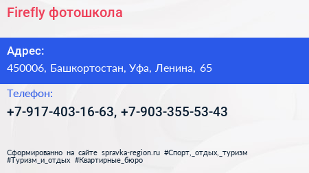 Firefly, фотошкола по адресу 450006, Башкортостан, Уфа, Ленина, 65 в дальнейшем Организация, размещена в следующих категориях: