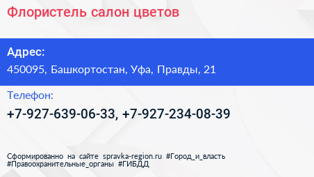 Флористель, салон цветов по адресу 450095, Башкортостан, Уфа, Правды, 21 в дальнейшем Организация, размещена в следующих категориях: