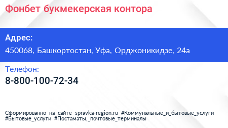 Фонбет, букмекерская контора по адресу 450068, Башкортостан, Уфа, Орджоникидзе, 24а в дальнейшем Организация, размещена в следующих категориях: