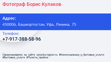 Фотограф Борис Кулаков по адресу 450006, Башкортостан, Уфа, Ленина, 75 в дальнейшем Организация, размещена в следующих категориях: