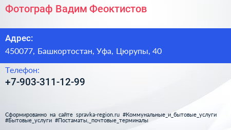 Фотограф Вадим Феоктистов по адресу 450077, Башкортостан, Уфа, Цюрупы, 40 в дальнейшем Организация, размещена в следующих категориях: