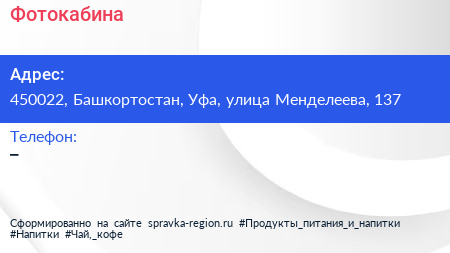 Фотокабина по адресу 450022, Башкортостан, Уфа, улица Менделеева, 137 в дальнейшем Организация, размещена в следующих категориях:
