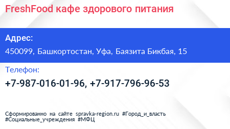 FreshFood, кафе здорового питания по адресу 450099, Башкортостан, Уфа, Баязита Бикбая, 15 в дальнейшем Организация, размещена в следующих категориях: