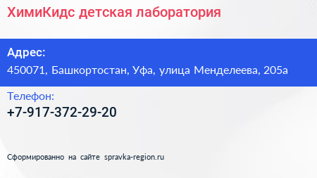 ХимиКидс, детская лаборатория по адресу 450071, Башкортостан, Уфа, улица Менделеева, 205а в дальнейшем Организация, размещена в следующих категориях: