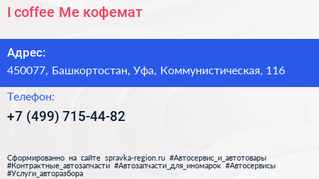 I coffee. Me, кофемат по адресу 450077, Башкортостан, Уфа, Коммунистическая, 116 в дальнейшем Организация, размещена в следующих категориях: