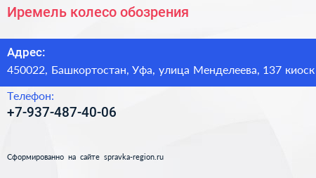 Иремель, колесо обозрения по адресу 450022, Башкортостан, Уфа, улица Менделеева, 137 киоск в дальнейшем Организация, размещена в следующих категориях: