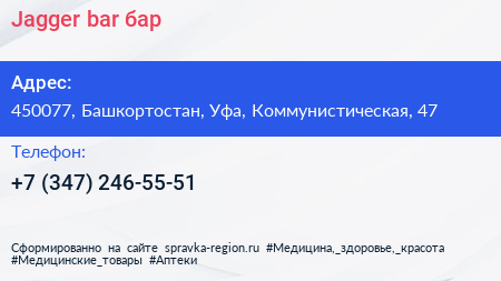 Jagger bar, бар по адресу 450077, Башкортостан, Уфа, Коммунистическая, 47 в дальнейшем Организация, размещена в следующих категориях: