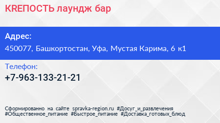 КRЕПОСТЬ, лаундж-бар по адресу 450077, Башкортостан, Уфа, Мустая Карима, 6 к1 в дальнейшем Организация, размещена в следующих категориях: