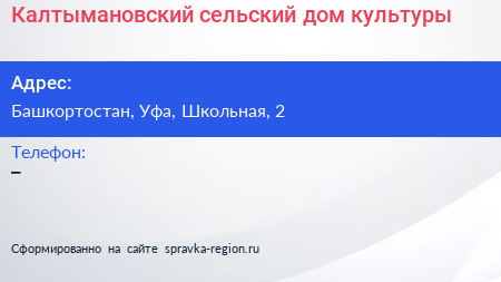 Калтымановский сельский дом культуры по адресу Башкортостан, Уфа, Школьная, 2 в дальнейшем Организация, размещена в следующих категориях: