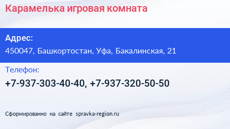 Карамелька, игровая комната по адресу 450047, Башкортостан, Уфа, Бакалинская, 21 в дальнейшем Организация, размещена в следующих категориях: