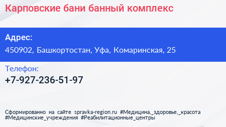 Карповские бани, банный комплекс по адресу 450902, Башкортостан, Уфа, Комаринская, 25 в дальнейшем Организация, размещена в следующих категориях: