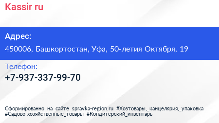 Kassir.ru по адресу 450006, Башкортостан, Уфа, 50-летия Октября, 19 в дальнейшем Организация, размещена в следующих категориях: