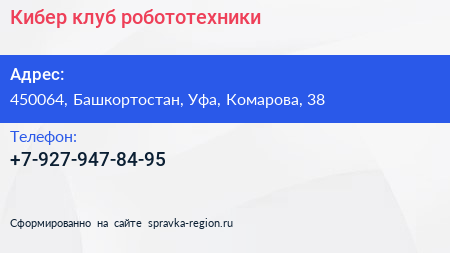 Кибер, клуб робототехники по адресу 450064, Башкортостан, Уфа, Комарова, 38 в дальнейшем Организация, размещена в следующих категориях: