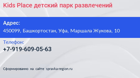 Kids Place, детский парк развлечений по адресу 450099, Башкортостан, Уфа, Маршала Жукова, 10 в дальнейшем Организация, размещена в следующих категориях:
