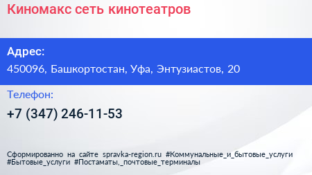 Киномакс, сеть кинотеатров по адресу 450096, Башкортостан, Уфа, Энтузиастов, 20 в дальнейшем Организация, размещена в следующих категориях: