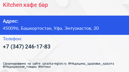 Kitchen, кафе-бар по адресу 450096, Башкортостан, Уфа, Энтузиастов, 20 в дальнейшем Организация, размещена в следующих категориях: