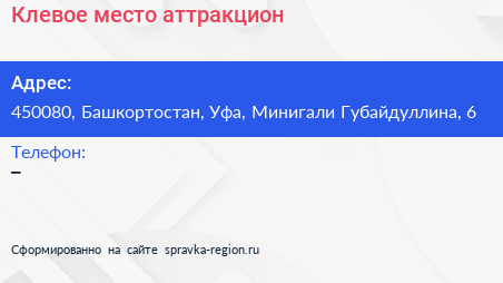 Клевое место, аттракцион по адресу 450080, Башкортостан, Уфа, Минигали Губайдуллина, 6 в дальнейшем Организация, размещена в следующих категориях: