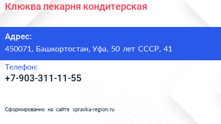 Клюква, пекарня-кондитерская по адресу 450071, Башкортостан, Уфа, 50 лет СССР, 41 в дальнейшем Организация, размещена в следующих категориях: