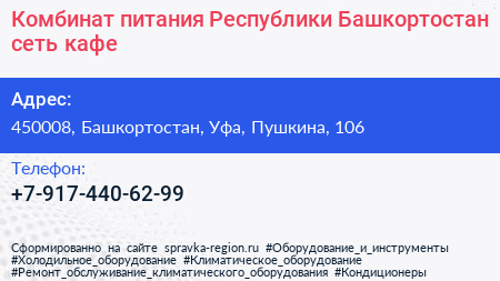 Комбинат питания Республики Башкортостан, сеть кафе по адресу 450008, Башкортостан, Уфа, Пушкина, 106 в дальнейшем Организация, размещена в следующих категориях: