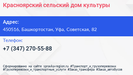 Красноярский сельский дом культуры по адресу 450516, Башкортостан, Уфа, Советская, 82 в дальнейшем Организация, размещена в следующих категориях: