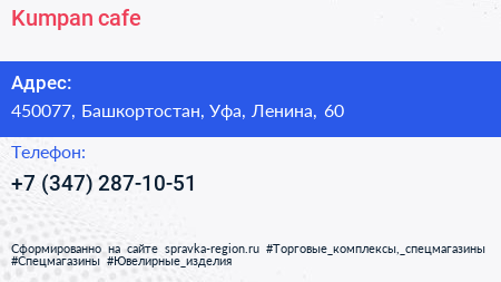 Kumpan cafe по адресу 450077, Башкортостан, Уфа, Ленина, 60 в дальнейшем Организация, размещена в следующих категориях: