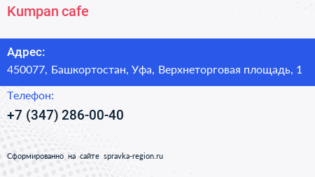 Kumpan cafe по адресу 450077, Башкортостан, Уфа, Верхнеторговая площадь, 1 в дальнейшем Организация, размещена в следующих категориях: