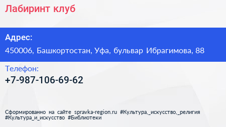Лабиринт, клуб по адресу 450006, Башкортостан, Уфа, бульвар Ибрагимова, 88 в дальнейшем Организация, размещена в следующих категориях: