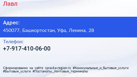 Лавл по адресу 450077, Башкортостан, Уфа, Ленина, 28 в дальнейшем Организация, размещена в следующих категориях: