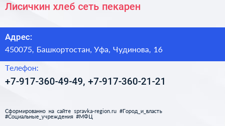 Лисичкин хлеб, сеть пекарен по адресу 450075, Башкортостан, Уфа, Чудинова, 16 в дальнейшем Организация, размещена в следующих категориях: