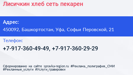 Лисичкин хлеб, сеть пекарен по адресу 450092, Башкортостан, Уфа, Софьи Перовской, 21 в дальнейшем Организация, размещена в следующих категориях:
